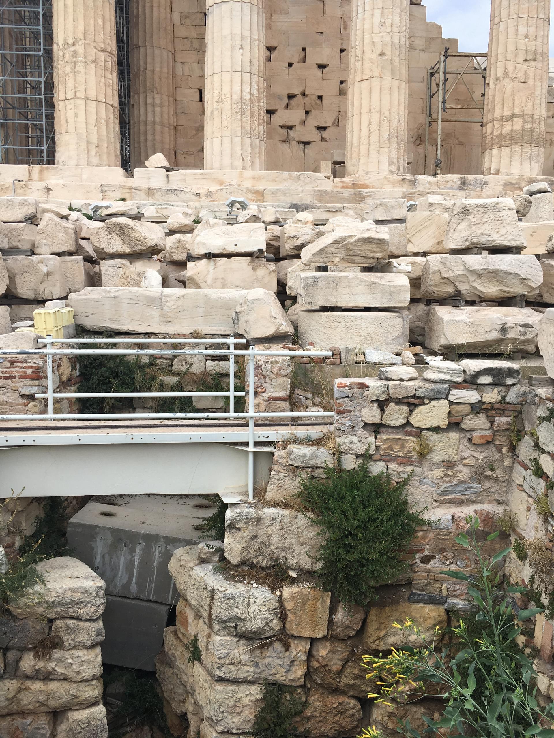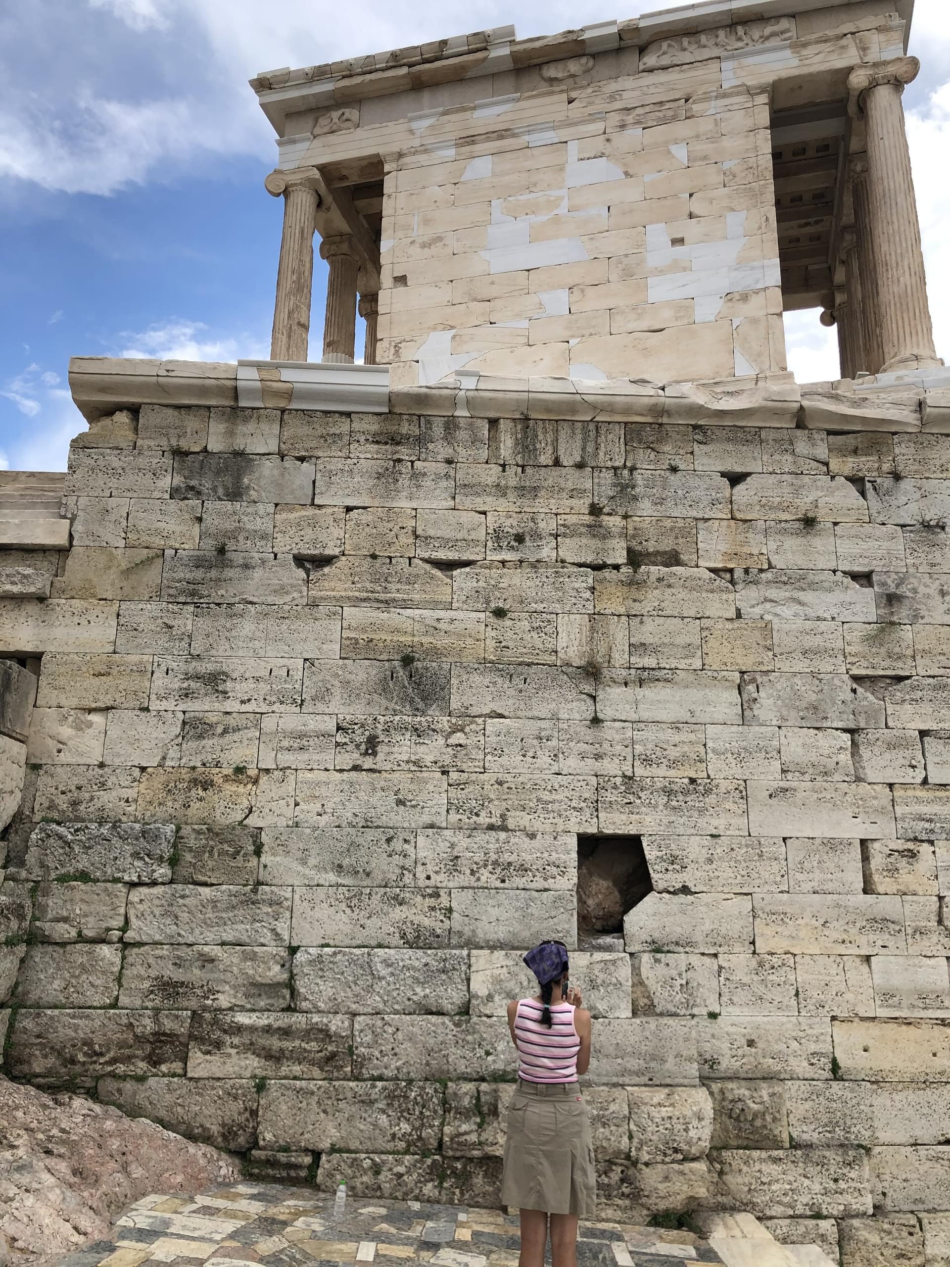 This picture captures the bastion supporting the charming little temple of Athena Nikē, which you will see immediately to your right as you climb toward the Propylaia when visiting the site. Note the strange little polygonal cutout in the bastion, which Emily is contemplating intensely in this picture: that cutout is part of the ancient masonry, and it was placed there so that Athenians of the fifth century themselves could contemplate the remnants of a bastion from the Late Bronze Age that is now encased by the stonework of the fifth century BCE.