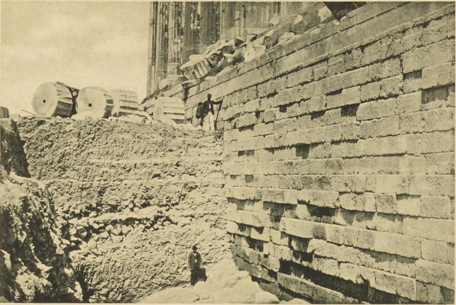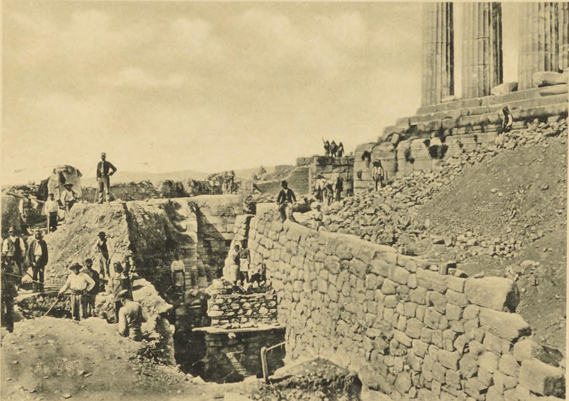 This is an image taken from Die Ausgrabung der Akropolis: vom Jahre 1885 bis zum Jahre 1890, by P. Kavvadia and G. Kaveraou (1907; retrieved from the Hathi Trust). It gives a rare glimpse of the Bronze Age fortification walls that now lie buried to the immediate south of the Parthenon, as they looked when the southern portion of the Acropolis was excavated in the nineteenth century. The gap housing the staircase visible in the modern excavation trench can be seen here near the middle of the photograph, just to the left of center.
